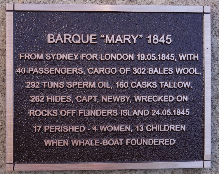 The Courier, Hobart on 26th June 1845 carried this account of the wreck of the Mary. NARRATIVE OF THE WRECK OF THE BARQUE "MARY," ON SATURDAY, TUE 24TH OF MAY, 1845 The Mary sailed from the heads of Port Jackson on Monday morning, the 19th May, and the wind being unfavourable for New Zealand Captain Newby coasted to the south, and attempted the passage through Bass's Straits. After doubling Wilson's Promontory the wind veered to the west; and the Captain, fearing that at the advanced season of the year the wind would continue for a length of time to the westward, resigned all hope of going home by the Cape of Good Hope, and putting about - ship made for New Zealand. He expressed regret at the disappointment he had met with, as, from the leaky state of the ship, which made six inches of water per hour, he wished to keep near the land as long as he possibly could the rigging also being very defective, and not having a second set of sails on board. At about a quarter past eleven o'clock on Saturday night, the 24th instant, the alarm of the ship being in danger was given by Captain Newby to the cabin passengers, who were all in bed, and be desired them to dress and hasten upon deck. The cabin passengers were - Mrs. Newby, her three daughters, and servant; Mrs. Turnbull; Mrs. Collins, four daughters, and one son at the breast, two maid-servants and myself. We had scarcely left our berths when the ship struck upon the reef, and the crushing noise of the timbers was distinctly heard above the roar of the breakers, and in less than three minutes the water rushed violently into the cabin as high as our knees, when she struck a second time. The mainmast then sank through the bottom of the ship, its maintop and topmasts being supported by the main deck. The same shock that caused such devastation forced the cabin door, which opened and shut in a slide, to close nearly on us, the ship at the time being so much on her starboard side, that it was doubtful whether she would not capsize. Fortunately, I perceived the door closing in sufficient time to introduce my hand into the open space so as to push back the door, and with the utmost difficulty I succeeded in getting upon deck all the passengers. This was scarcely effected when the bottom of the ship separated from the sides, carrying away the lower cabin deck, which we had just left - the tuns of oil and cargo dashing against the reef, and the breakers washing over us with fearful violence. The only boats that were available were the whaleboat on the larboard quarter, and the long- boat on the main deck. Some of the passengers were put into each of these boats, and I had just placed Mrs. Collins in the long-boat, when I heard Sarah calling for me to take the boy from her, as she was unable to bold him any longer. I, with great difficulty, reached her, and put a rope into her hand, which I desired her to hold by until I had put the child into the boat, when I would return for her and my two girls. Augusta and Kate, I had scarcely left her when a breaker broke over the deck, carrying me with great force against a waterbutt. I effected my way to the long-boat; and while I was giving the child to its mother, the main-topmast fell overboard, crushing the whale- boat, which was lying upon the skids alongside of it, and immediately after the fore and mizenmasts, with all their sails set, also fell overboard on the starboard side, on which the deck righted; but the rigging of these masts all lying across the deck, intercepted the communication fore and aft. I was searching for my two daughters. Augusta and Kate, and the maid Sarah, when I met the captain, who informed me that he had just put them with his family, a moment before, in the whale-boat on the larboard quarter, where they were all safe; that the deck was about breaking up, and if I valued my life I would follow him. He wished to have returned to the whale-boat, but the deck beginning to separate, he made immediately for the long-boat, which we contrived to reach. The breakers continued to wash over us, and the masts being gone, we had no power to launch the boat, and no visible means then presented themselves to save us from the fearful dangers that thus accumulated round us. At this critical moment, when all hope of preserving life had nearly abandoned us, the deck suddenly parted between the main and foremasts, and the long, boat pitched stern foremost into the sea, and not- withstanding the quantity of water and people in her, she quickly righted. We found the water gaining on us, and then discovered that both the plugs were out, on which one of the men tore the sleeve off his shirt, and by its aid partly succeeded in stopping the water. With the aid of boots, shoes, and hats we continued to keep the boat afloat, but having only one oar we had the greatest difficulty in avoiding the numerous casks and broken wreck which threatened us on every side. From the time the ship struck until the deck broke up only seven minutes had elapsed. While we were surrounded by the floating pieces of the wreck, a huge wave dashed a cask of tallow over my head against the inside of the starboard side, near the stern, and carried away eighteen Inches of the gunwale and upper streaks ; a tun of oil followed the course of the cask of tallow, striking off my hat in its passage, but the cask of tallow having already made a breach in the side of the boat it met with no resistance, and passed into the sea, deluging the boat with oil. One of the sailors, named Todd, swam to the boat from the wreck with an oar, and we then got into smooth water. The sea outside the reef, as well as the wind, being nearly calm, we heard the voices of some sailors, which we supposed to be the men in the whale-boat, and we steered in the direction the sound came from. On nearing these men they stated the whale-boat had foundered, and that Mrs. Newby was the only person saved. Her escape was effected by her catching a rope along, side the bro